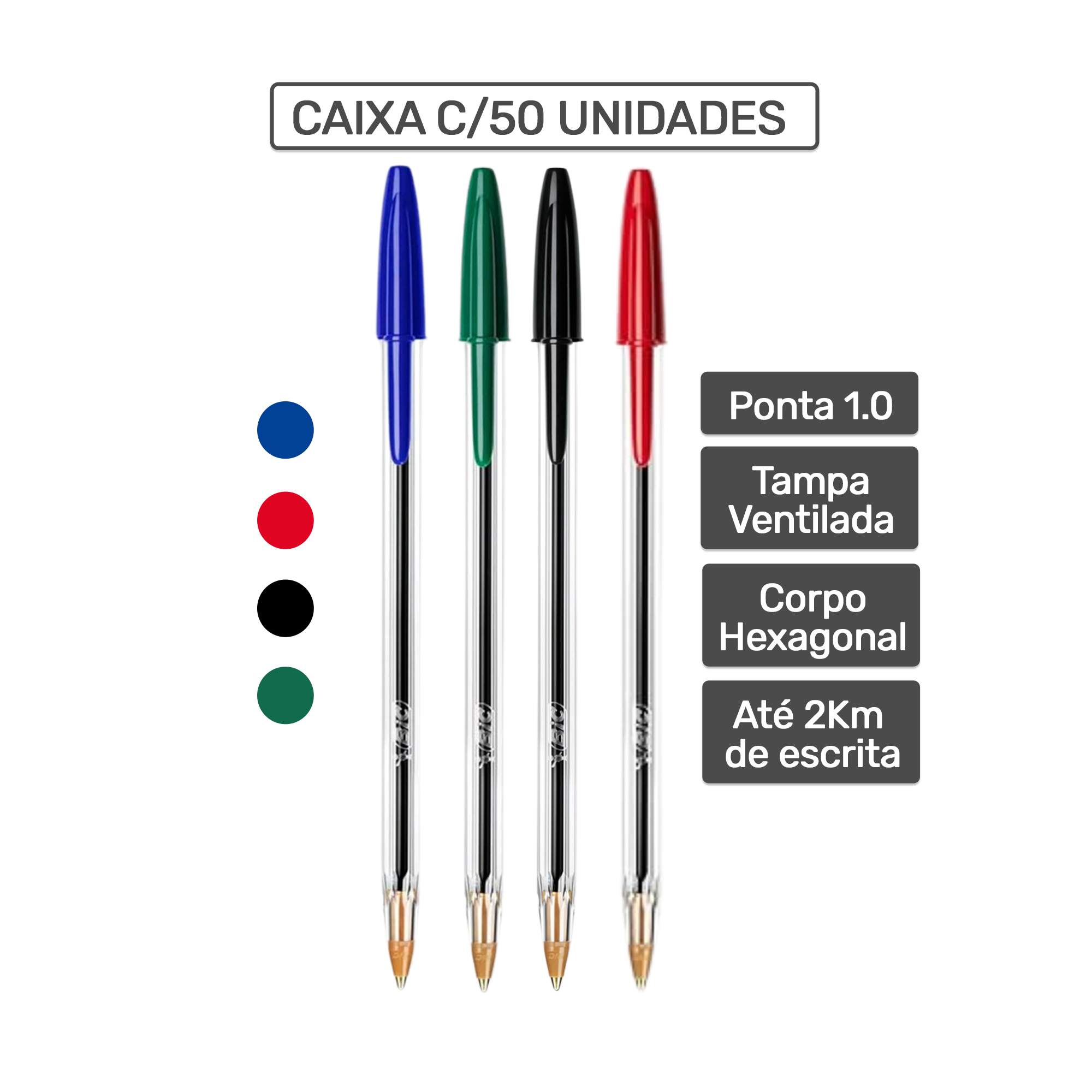 Caneta esferográfica clássica e favorita em milhares de lares, escritórios e escolas no mundo. Possui corpo hexagonal que assegura o conforto na escrita e transparente para visualização da tinta Tinta de alta qualidade, que seca rapidamente evitando borrões na escrita. Maior Durabilidade: Escreve até 2 Km. Escrita macia. Fabricada com a quantidade certa de matéria-prima para uso prolongado e seguro. Não contém PVC. Possui tampa da mesma cor da tinta e também é ventilada em conformidade com padrão ISO. Ponta Bola de Tungstênio, esfera perfeita e muito resistente. 100% das esferográficas são feitas por um processo altamente controlado. Perfeitamente esféricas, elas são quase mais duras do que o diamante. A BIC fez o sucesso da esferográfica. Desde seus inícios em 1950, a Companhia vem aperfeiçoando as máquinas e os processos de fabricação necessários para produzir canetas de alta qualidade e produzidas em massa.