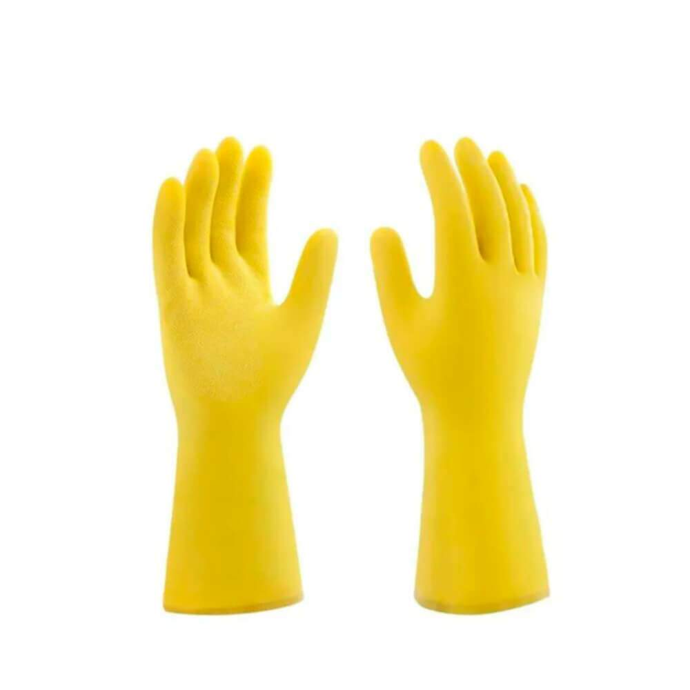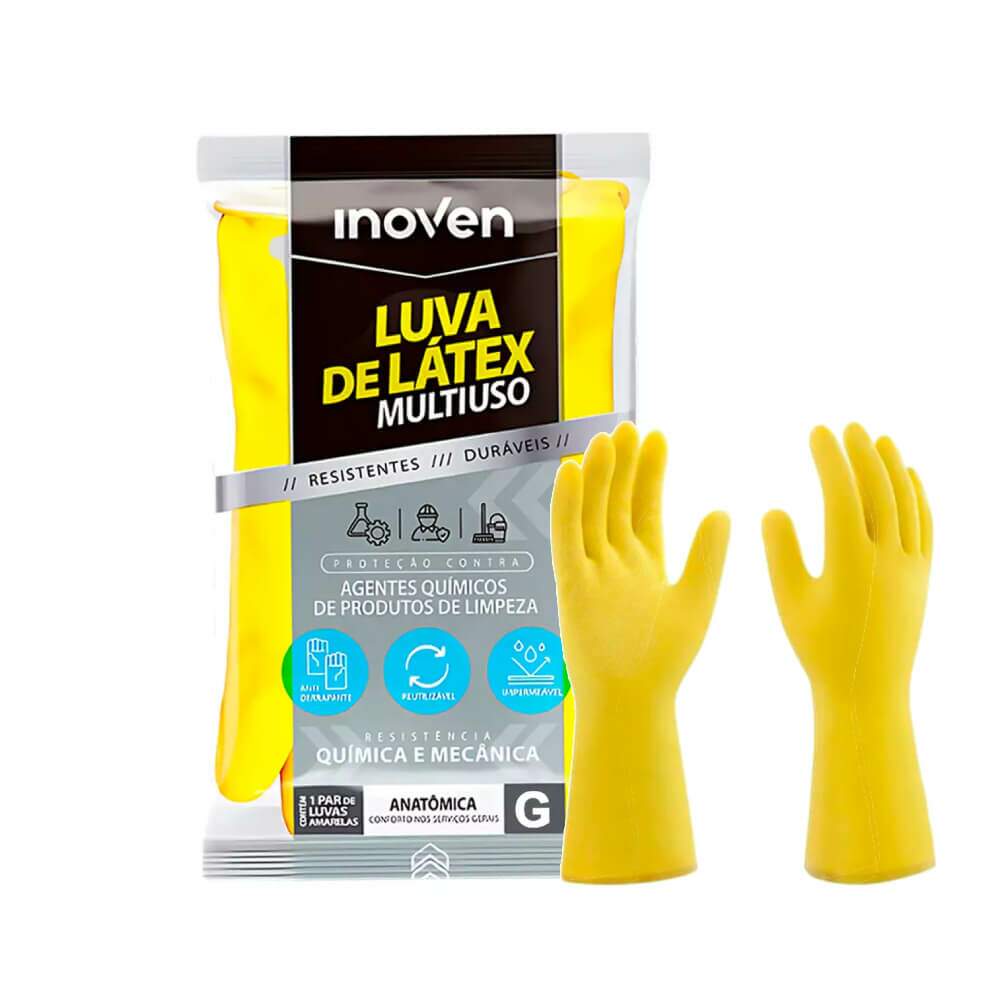 A Luva de Látex Multiuso Amarela Inoven é ideal para a segurança e proteção das mãos contra produtos químicos de limpeza. É confeccionada em 100% de látex de borracha natural, possui palma e ponta dos dedos com textura antiderrapante, anatômica, sem forro (não flocada), com virola, impermeável e econômica, pois pode ser reutilizada.